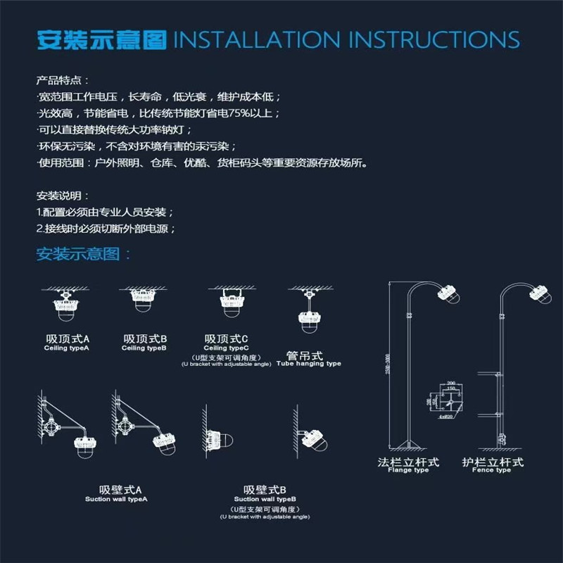 本產品有長短兩款,短款做到功率50W內,可以吸頂式,護欄式,吊桿式,等各種安裝方式